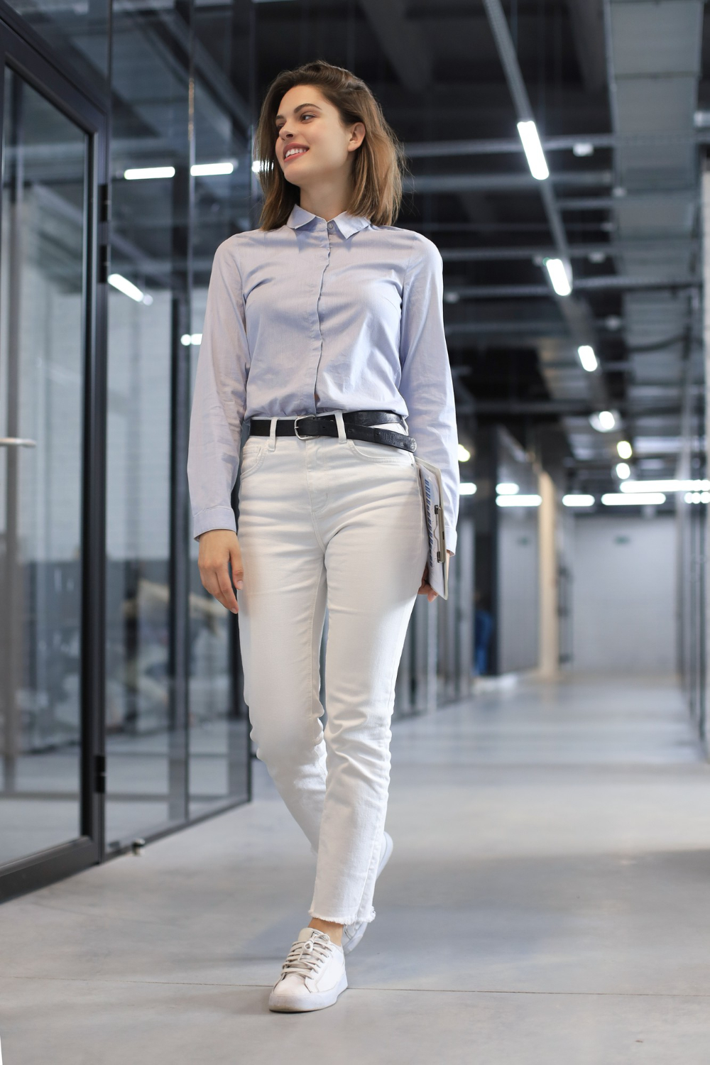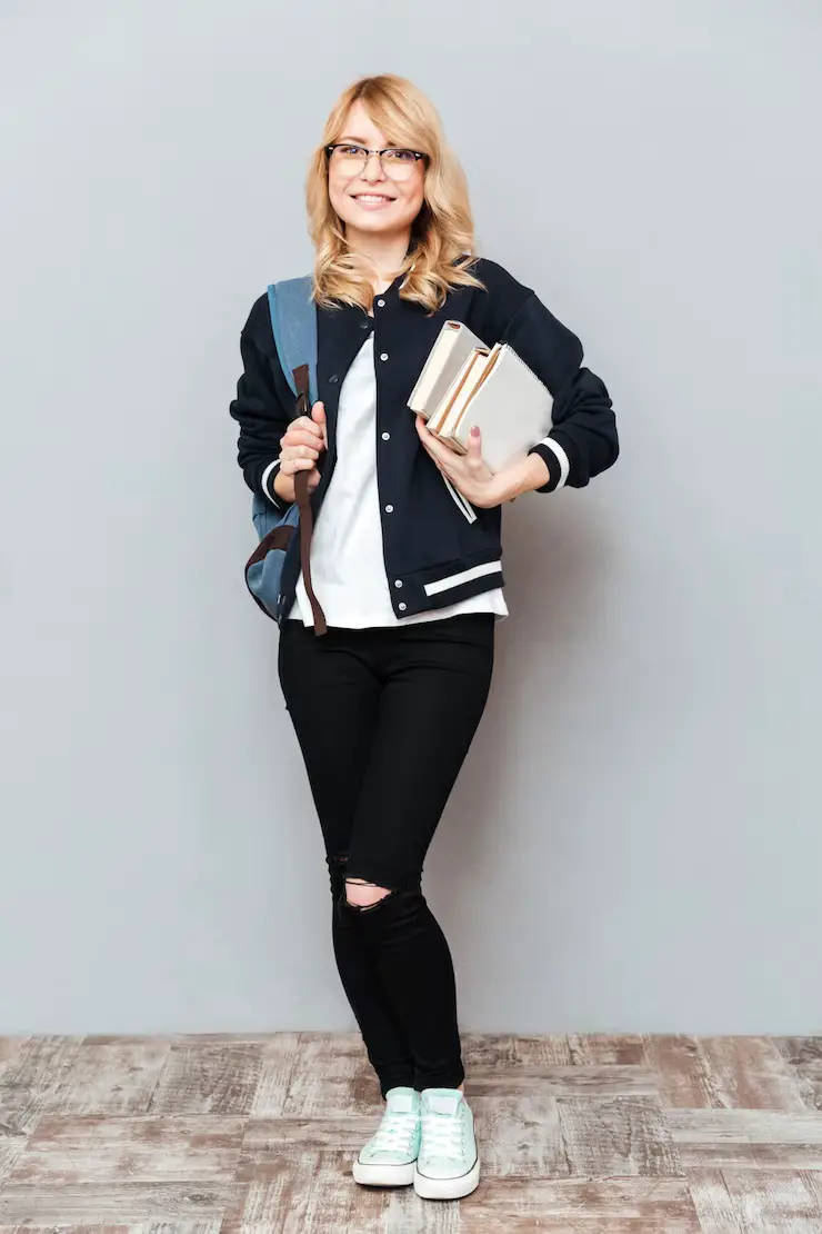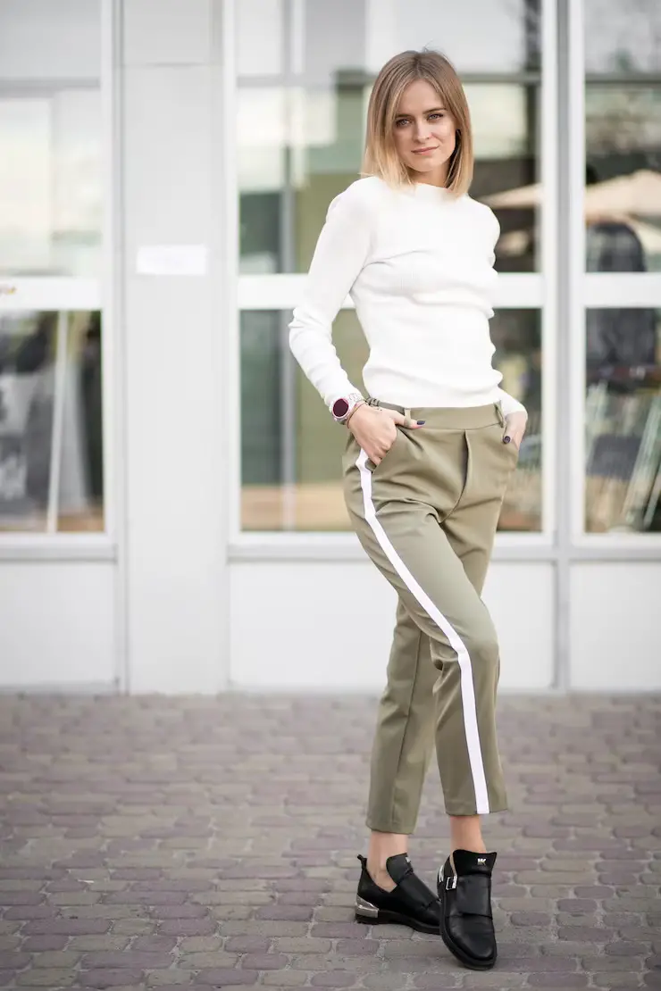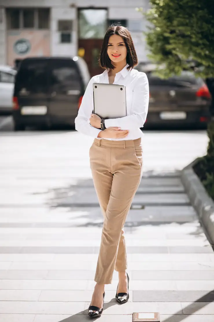 Otra opción para ir a la universidad es combinar tu pantalón de vestir con una camisa blanca de botones y un blazer. Este look te dará un aspecto profesional pero sin dejar de ser apropiado para un ambiente estudiantil. Añade unos zapatos de tacón bajo y un bolso estructurado para completar el conjunto.